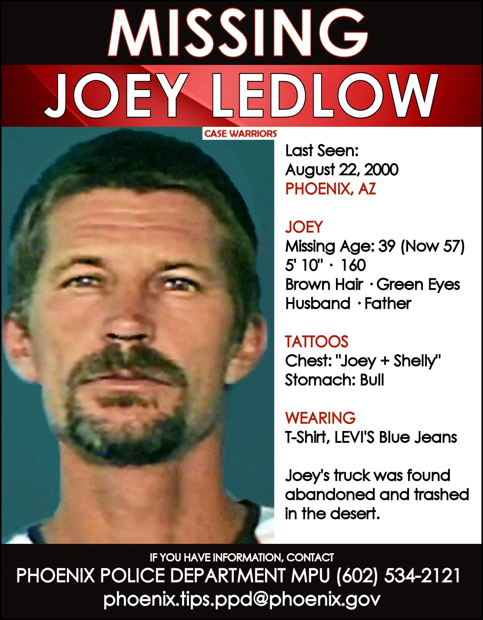 If you have information regarding the disappearance of Joey Gale Ledlow, please contact the Phoenix Police Department Missing Persons Unit at (602) 534-2121 or phoenix.tips.ppd@phoenix.gov.